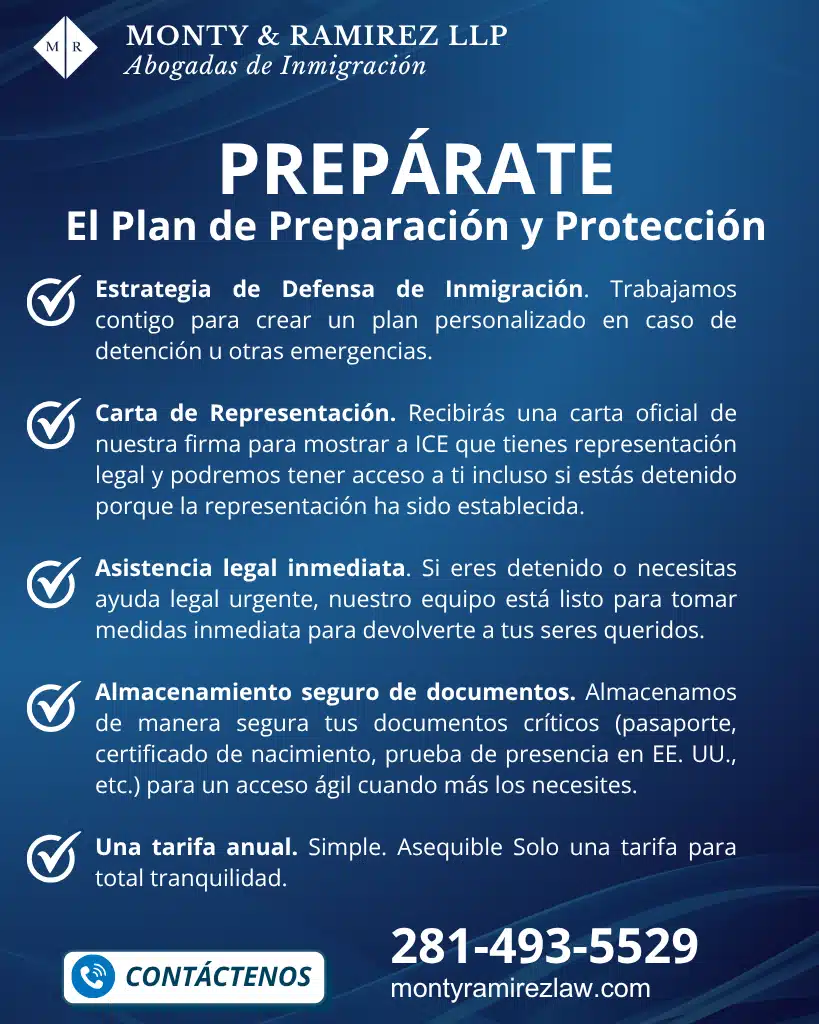 Monty & Ramirez LLP se enorgullece de estar junto a nuestra comunidad a través del Plan Prepárate—el Plan de Preparación y Protección—una iniciativa proactiva de preparación para la inmigración diseñada para brindar una verdadera tranquilidad a las familias que enfrentan tiempos inciertos. Prepárate, que significa “planear para estar listo” en español, llama a las personas a enfrentar la realidad de que algún día pueden necesitar defenderse a sí mismos o a un ser querido en la corte de inmigración. En lugar de depender de falsas esperanzas o promesas vacías, Plan Prepárate empodera a las personas indocumentadas para que tomen el control de su futuro con una estrategia legal personalizada y una relación de confianza con un abogado de inmigración experimentado.